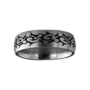 Alliance En Acier Satiné Avec Gravure Noire Motifs Tribals