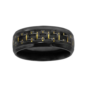 Bague en acier et PVD noir avec quadrillage en carbone et fils dorés