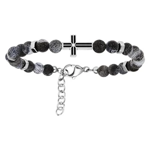 Bracelet en acier avec perles d’Agate grise avec Croix sur le dessus 19+2cm