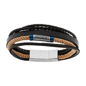 Bracelet En Acier Et Cuir Multifils Noir Et Beige PVD Bleu 19,5cm