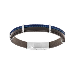 Bracelet en acier et cuir noir avec 2 câbles bleu et double fermoir 20+1cm