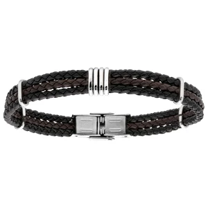 Bracelet En Acier Et Tresse Pu Noir Et Marron 20cm Réglable