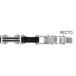 Bracelet réversible en acier 1 côté alternance de maillons lisses en PVD noir et maillons rayés noir l’autre côté alternance de maillons gris lisses et rayés noir – longueur 19+1cm réglable