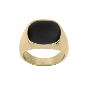 Chevalière en acier et PVD jaune plateau noire de synthèse