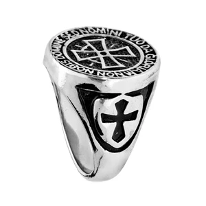 Chevalière en acier plateau rond avec croix des Templiers fond noir