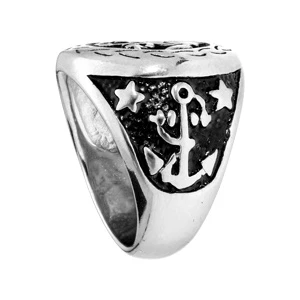 Chevalière En Acier Plateau Rond Motif Ancre Marine