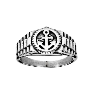 Chevalière En Acier Ronde Avec Ancre Marine Patinée