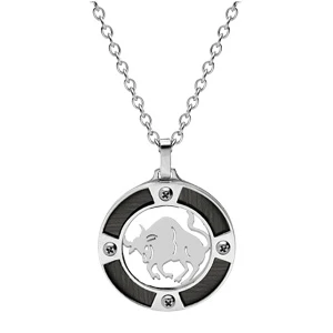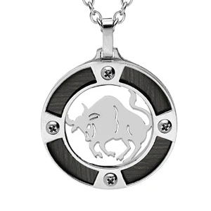 Collier en acier chaîne avec pendentif rond zodiaque Taureau aspect bois noir et vis cruciforme 50+5cm