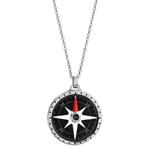 Collier en acier chaîne avec pendentif rose des vents sur fond noir – longueur 50cm + 5cm de rallonge