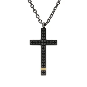 Collier en acier et PVD noir et jaune chaîne avec pendentif grande croix et oxydes noirs 50+5cm