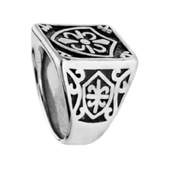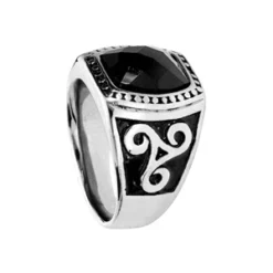 Chevalière En Acier Plateau Rectanguleire Avec Pierre Facettée Noire Et Motif Trèfle Sur Coté